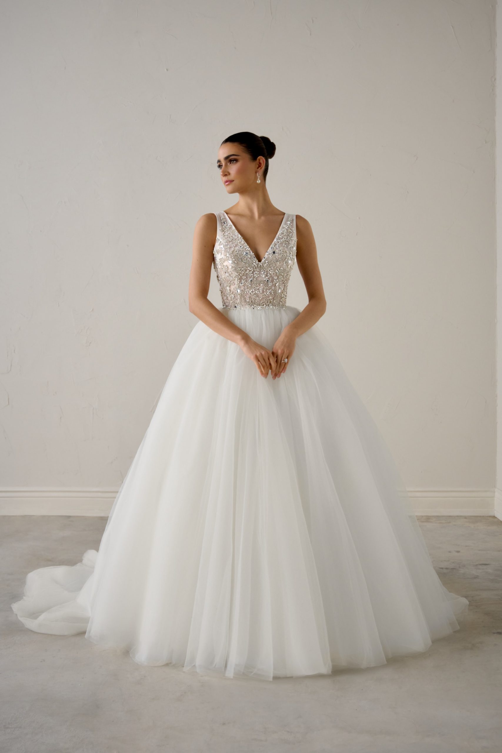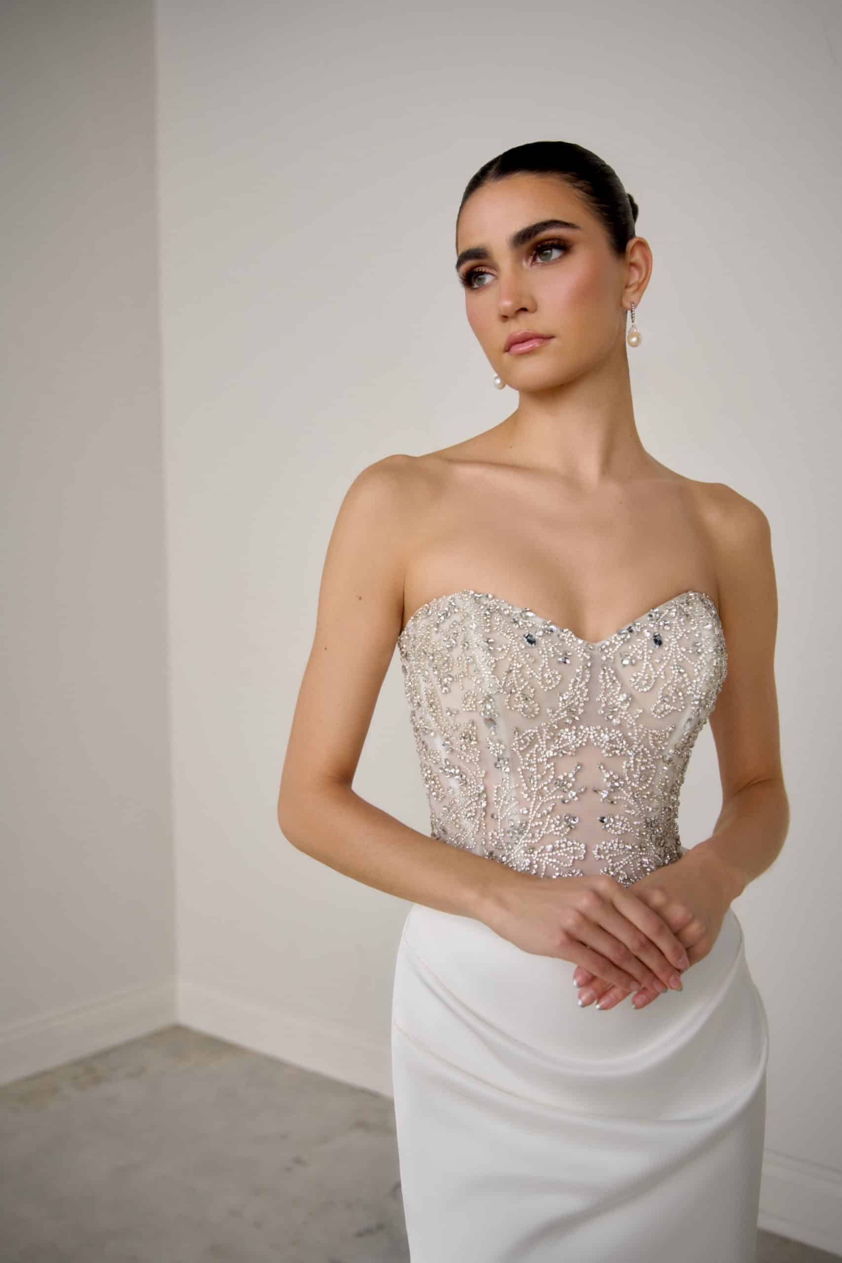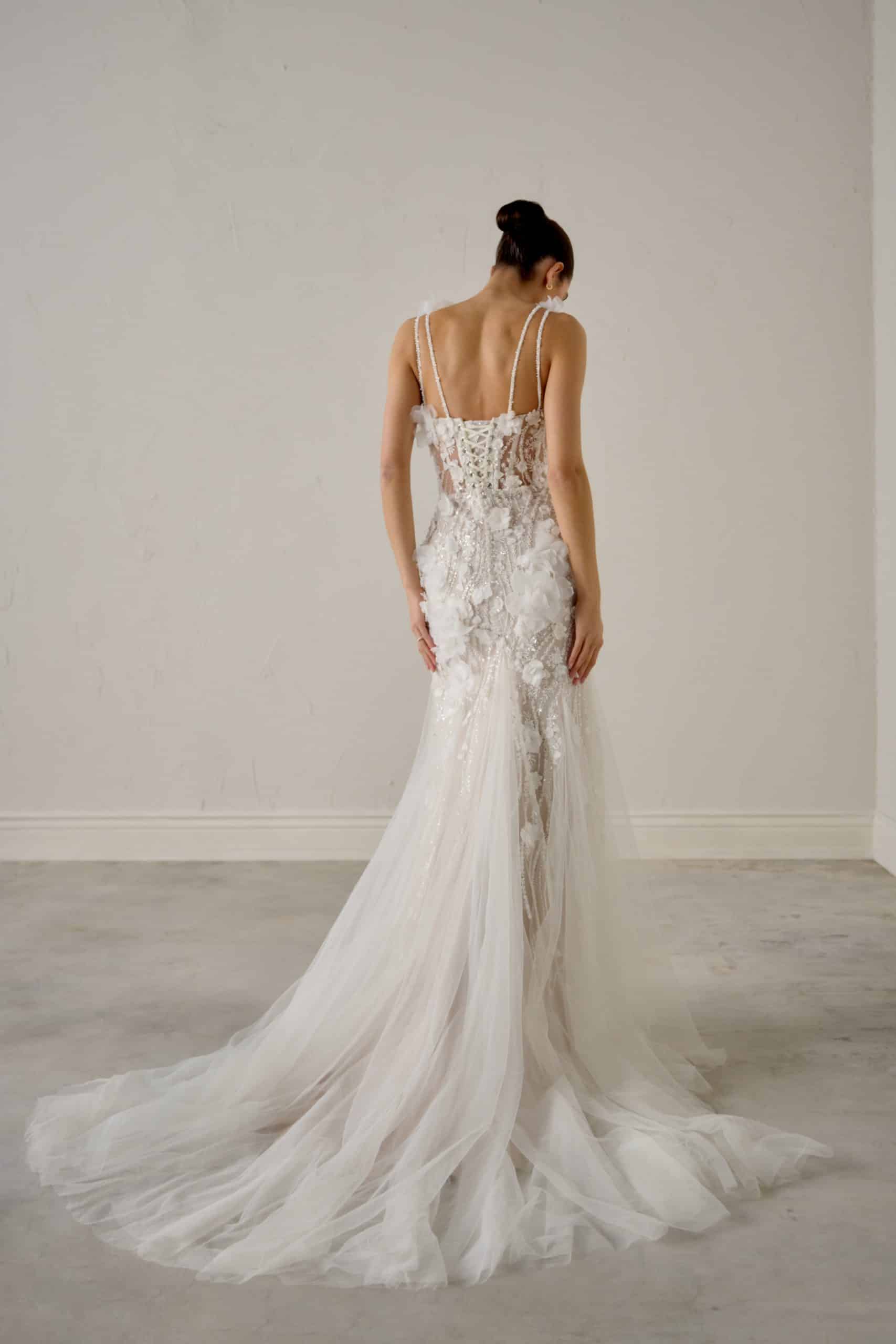 Broderies raffinées et cristaux Swarovski embellissent la soie et la dentelle.