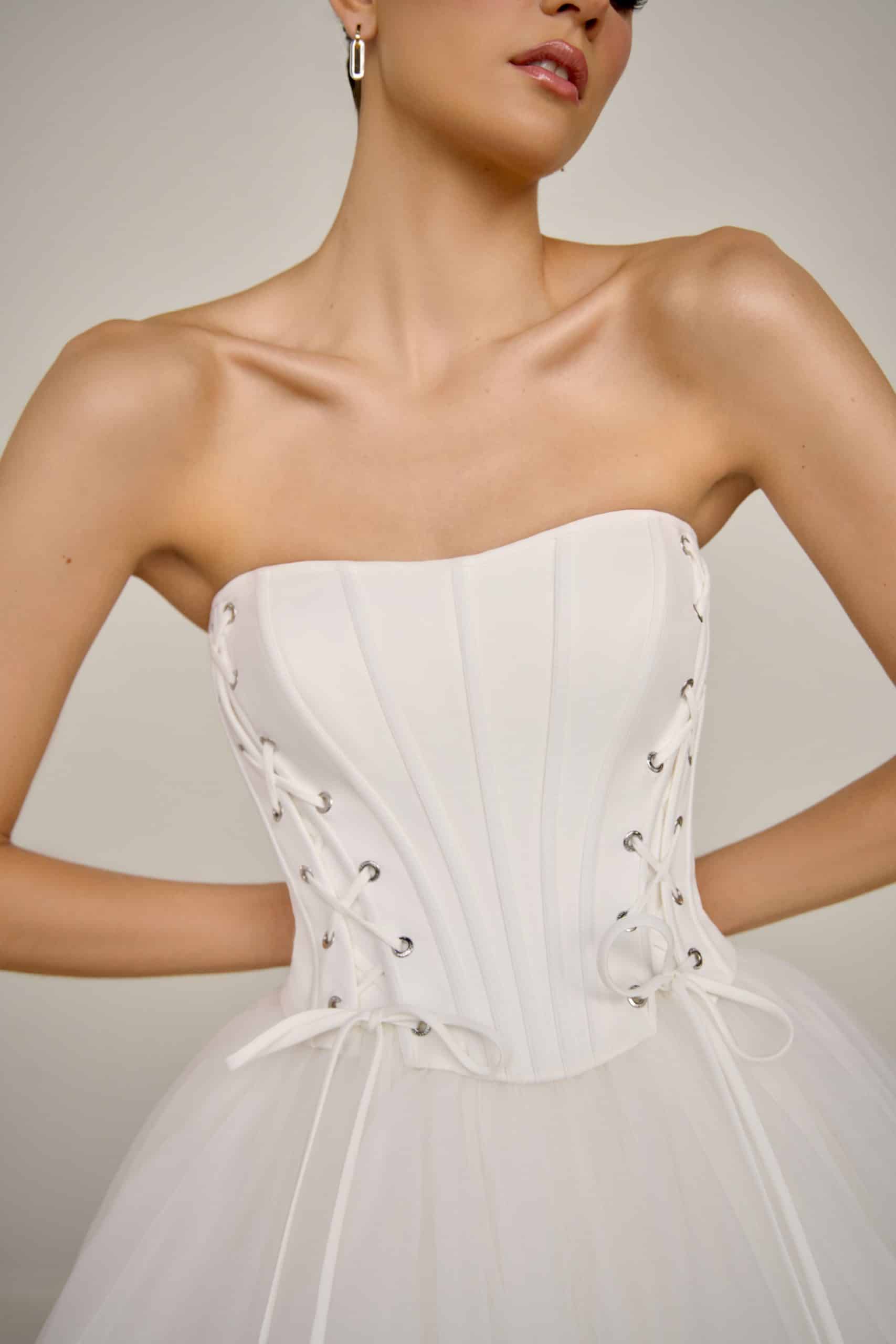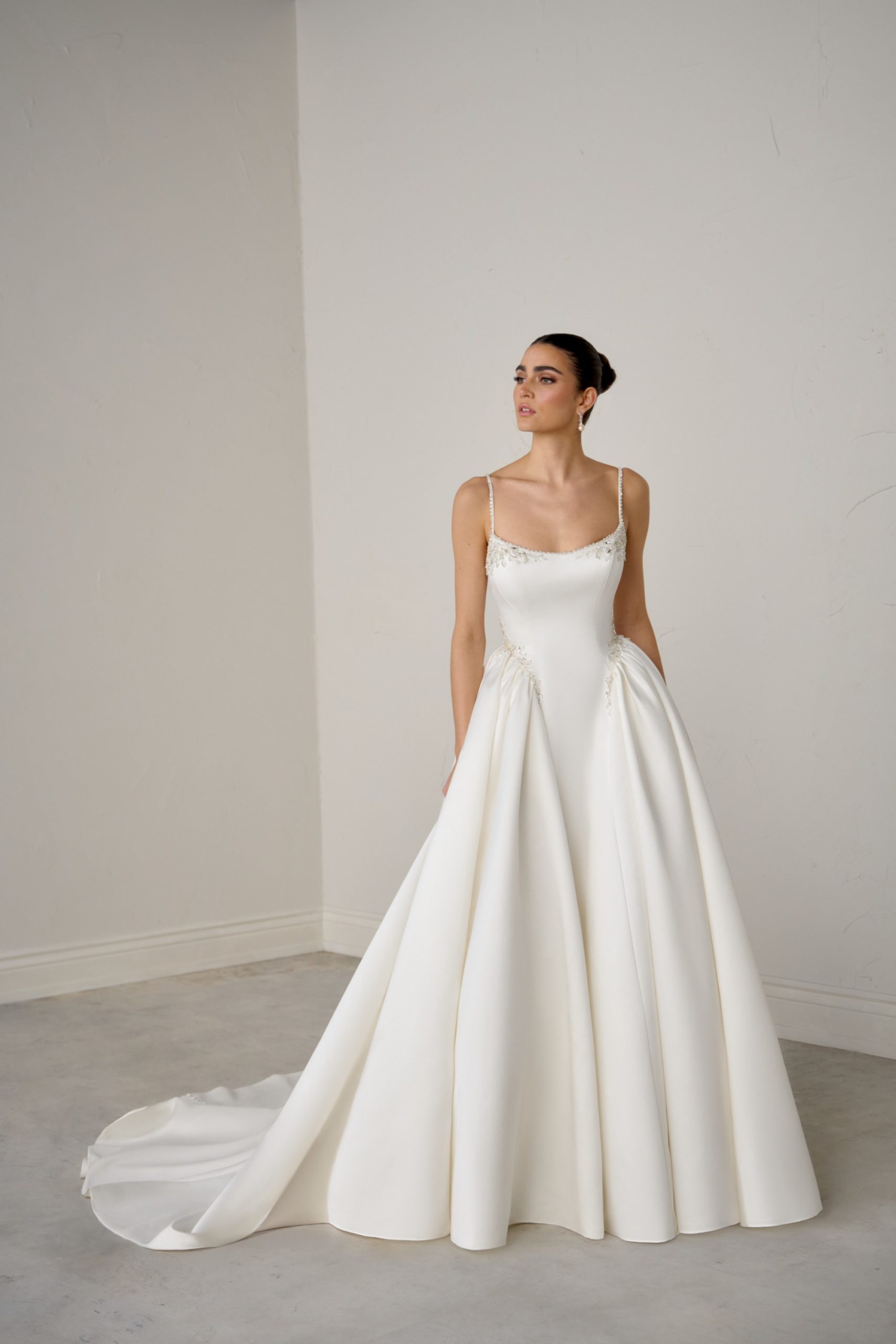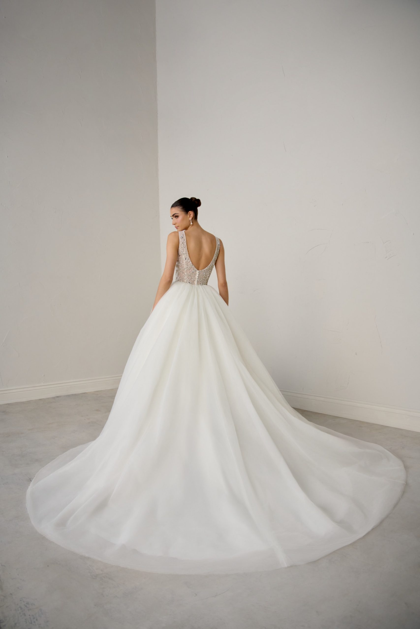 Broderies raffinées et cristaux Swarovski embellissent la soie et la dentelle.
